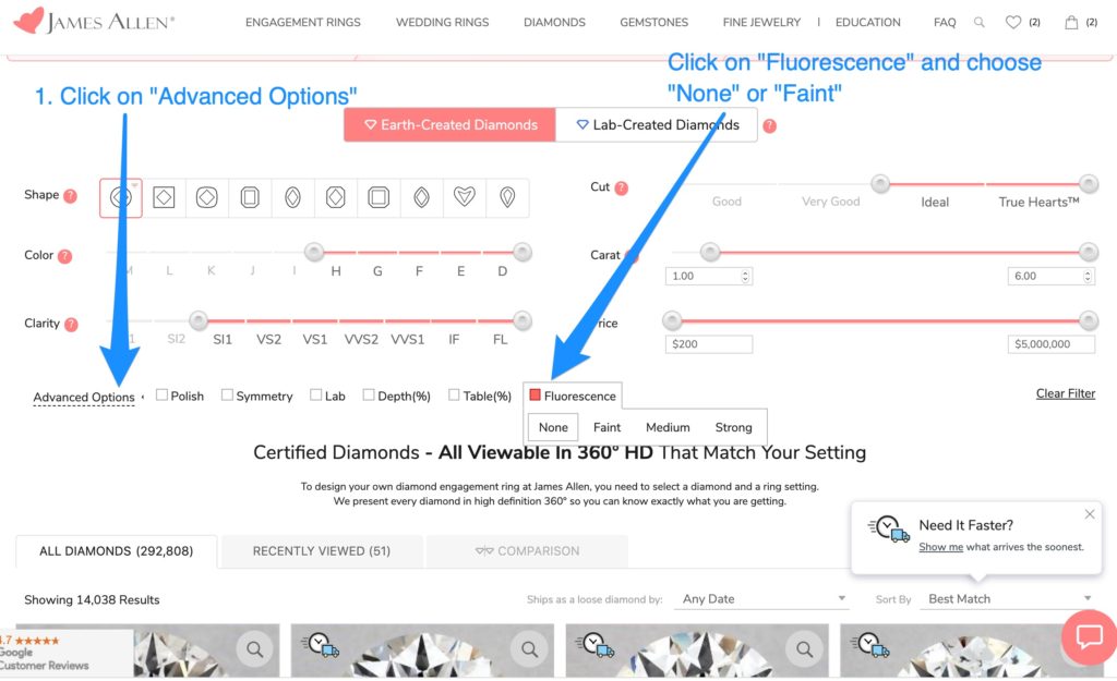“How can I filter to shop only for diamonds without fluorescence?” Go to James Allen. Choose “Start with a diamond.” Then click on “Advanced Options.” Then click on “Fluorescence” and choose the level of fluorescence you want to see.