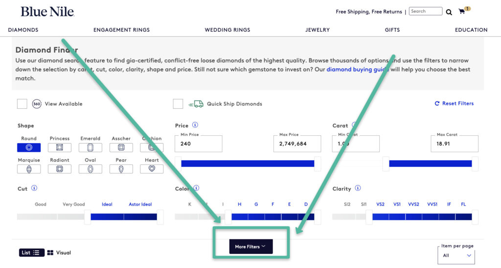 - Click “More Filters” on the diamond search page.