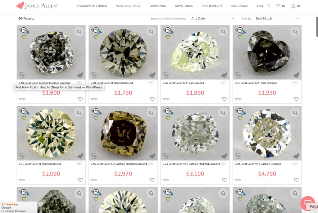 It’s to use the price sorting filters at James Allen, Leibish & Co, or any other reputable dealer of fancy color green diamonds that you choose to shop with.