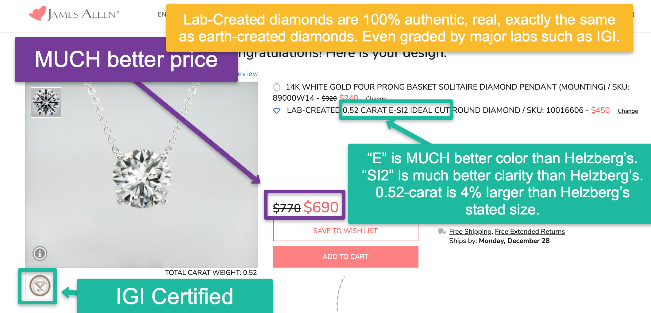 The James Allen lab-created diamond in this example has the Color E. That’s an incredibly huge jump in quality, compared to the Helzberg offer. (Plus, it’s IGI-certified, which, again, means the color grade is REAL.)