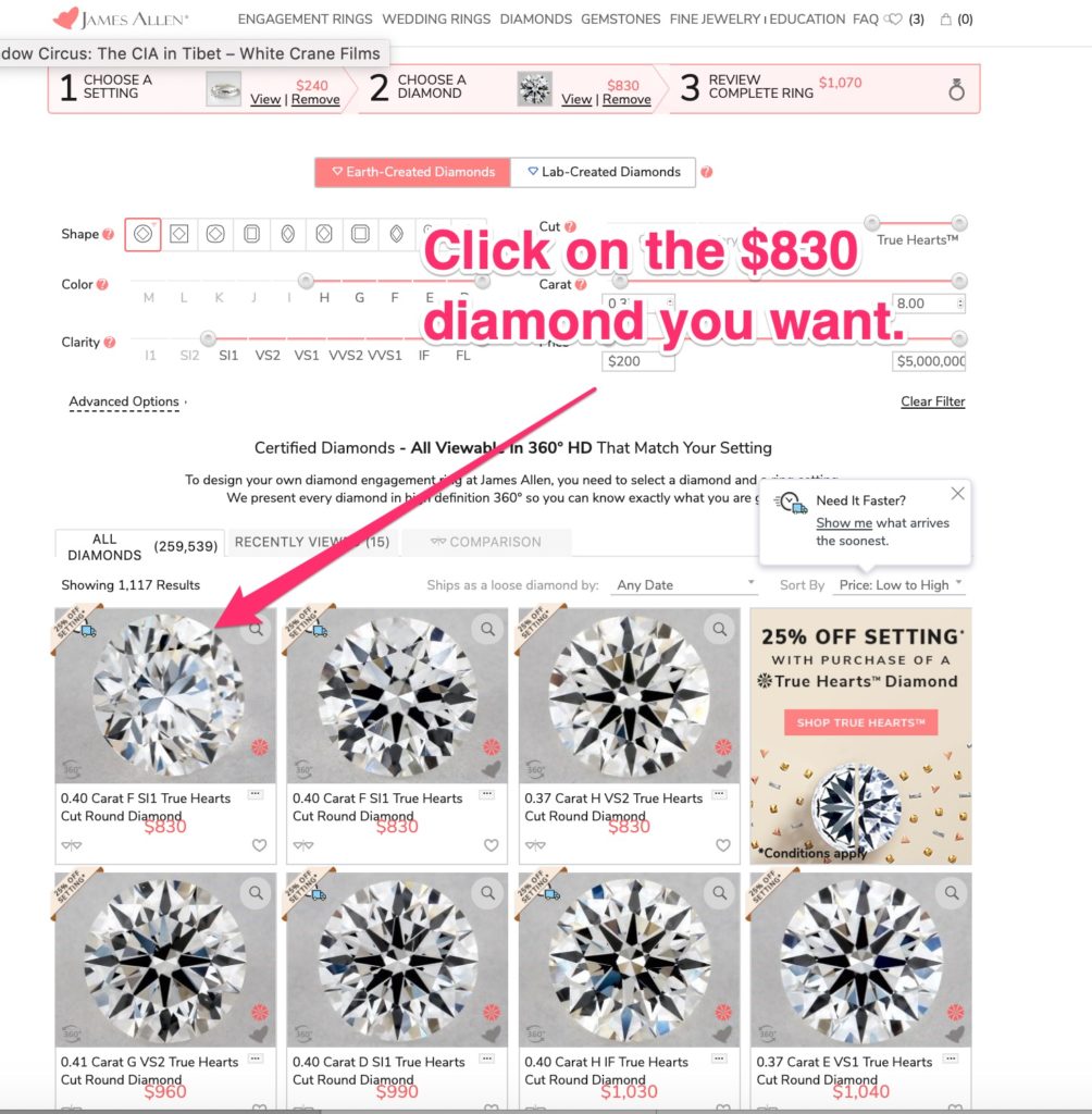 2. Click on the True Hearts diamond you want (currently for $830!) …