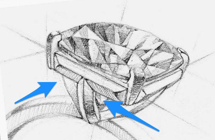 Do you see what I see in the massive T by the diamond in the illustration below? It reminded me of a Tesla emblem. Which is awesome on a car, but not what I want to think of when I see an engagement ring. A diamond is forever. An icon or emblem for a hood ornament really isn’t.
