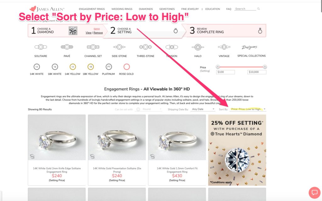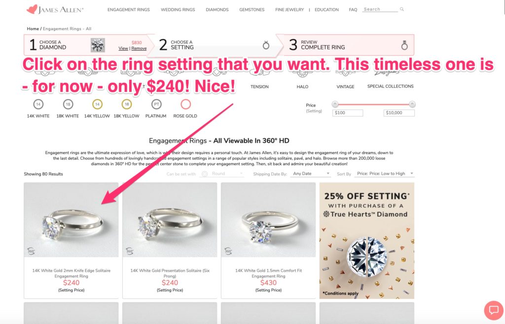 This of course adds the loose diamond to a ring package. Now you’re about to select a setting (which at the time of this writing is 25% off) …