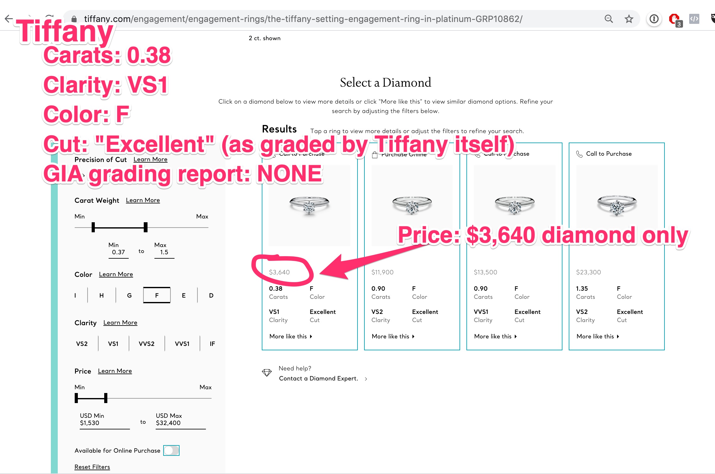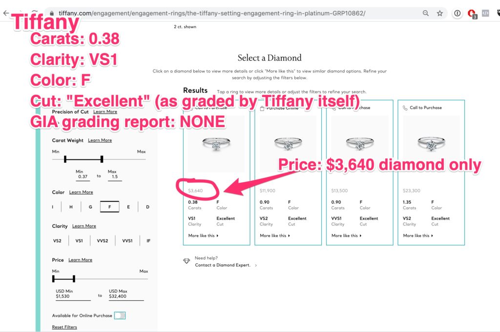 This Tiffany-certified Tiffany diamond is $3,640 (see the image below)