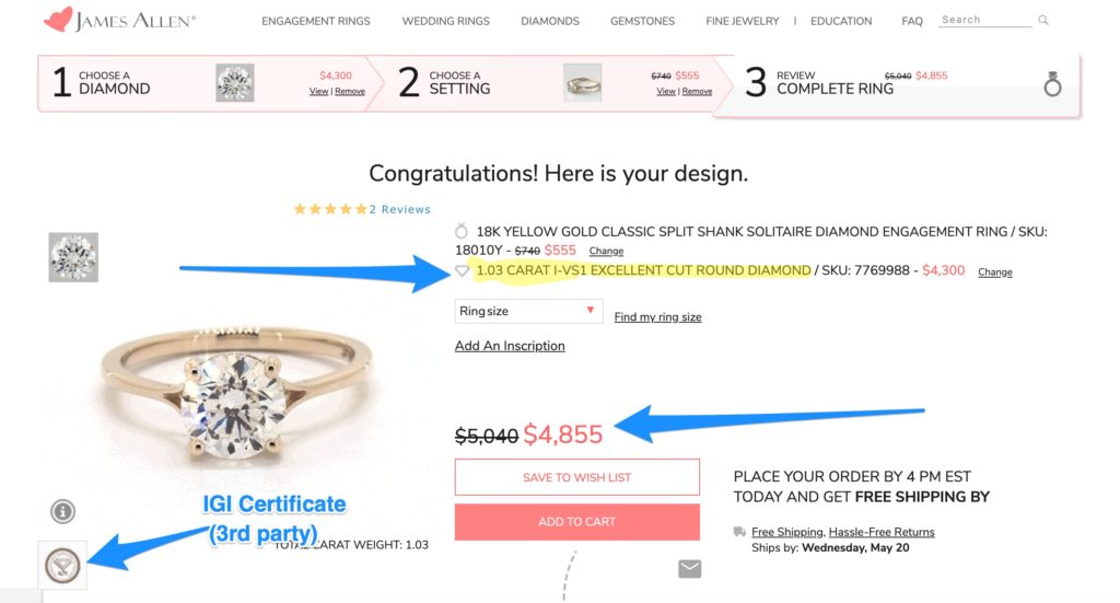 Then you might look at a ring at James Allen and think, “Well maybe this one’s better — I can look at it endlessly in 3D imaging. And there’s a GIA certificate, not just a store’s own certificate.”