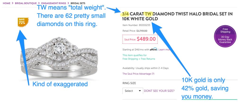 If price is of paramount importance to you right now, you really want a diamond, and not a ruby or sapphire, and you can’t responsibly afford an engagement ring costing into several thousands of dollars, then these are perfectly respectable choices. They’re trustworthy and declare what they’re selling. Just never buy from them unless it’s on sale and/or you have a big coupon to apply. The reason is that the “list” prices are rather pricey for what this jewelry is. It’s perfectly good jewelry. But the list prices are kind of jacked up.