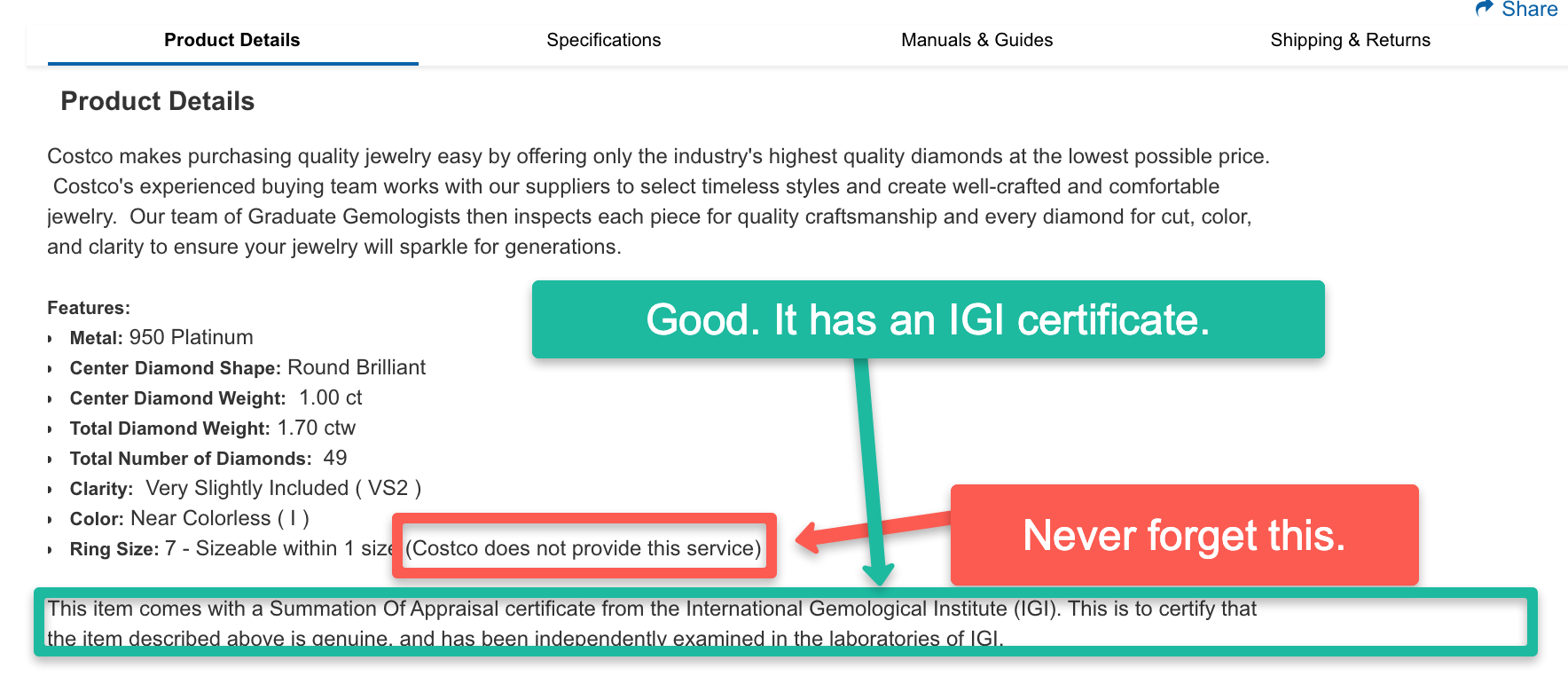 About the Costco diamond, once again, we just don’t know. They didn’t tell us the cut quality, that I could find anywhere on that product page. (And it certainly wasn’t in the usual place, the easy-to-find specs list.
