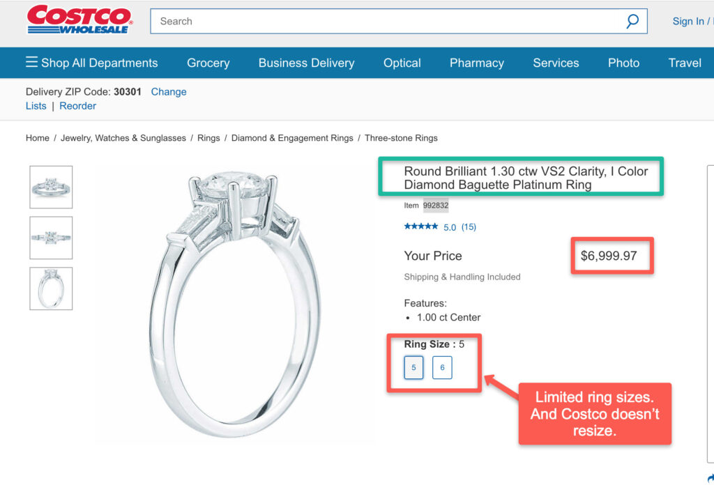 You can get a diamond with a certificate / grading report, and baguette diamonds with information on them, and a setting that is at least as good as the Costco if not better, for far less than you would have paid the big box store.