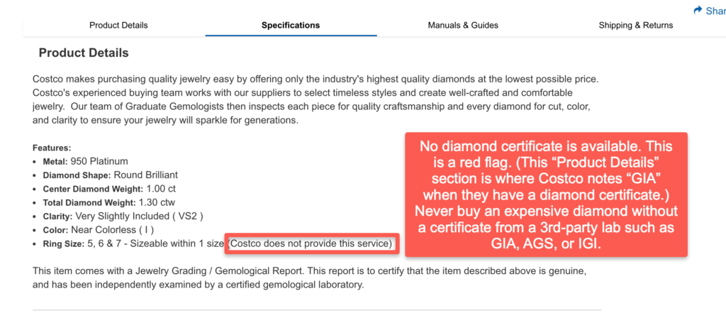 Often Costco does have such a certificate for a diamond ring. If they do, it’s always the first thing noted under the “details” section (pictured above).