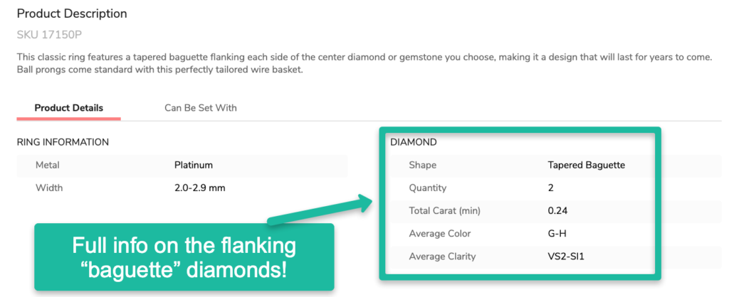Furthermore, when you look at the product page of the setting alone (the ring itself, with the baguette diamonds, but not the center diamond yet), you’ll see that it tells you the color and the clarity grades of the baguette diamonds!
