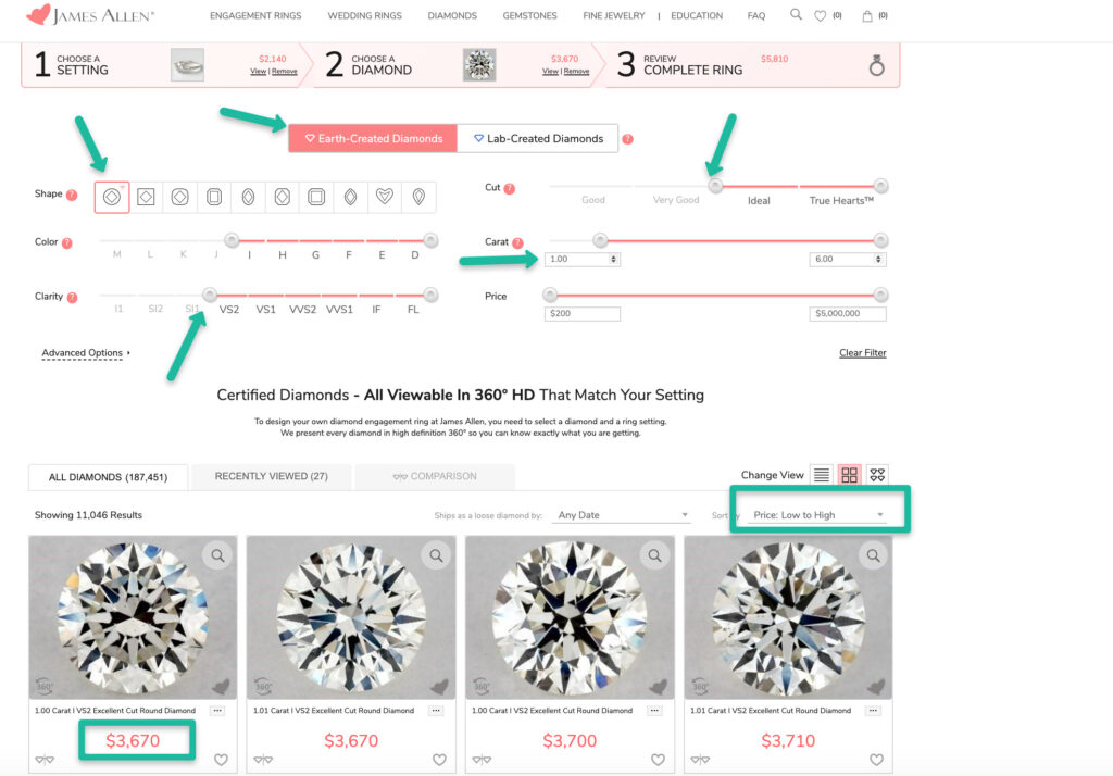 - Then select a Lab Created diamond you like and add it to the setting. It’s tons less money.