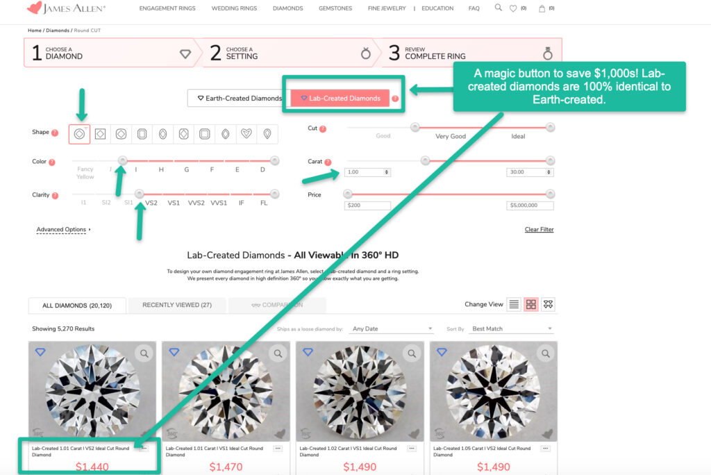 - At the James Allen diamond inventory search tool, choose Lab Created instead of Earth Created. (See the image below.) (Lab Created diamonds are 100% identical, exactly the same substance, as Earth Created diamonds. They’re not fake. They’re real. They’re just made in a lab mimicking conditions deep inside the earth.)