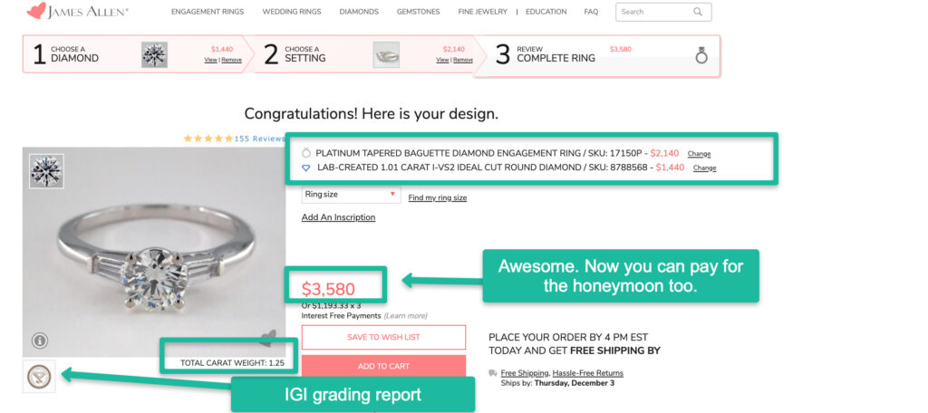 You’ll see that James Allen of course also offers an IGI diamond grading report. (You can also find, at James Allen, similar diamonds with a GIA grading report, which is the industry “gold standard.”)