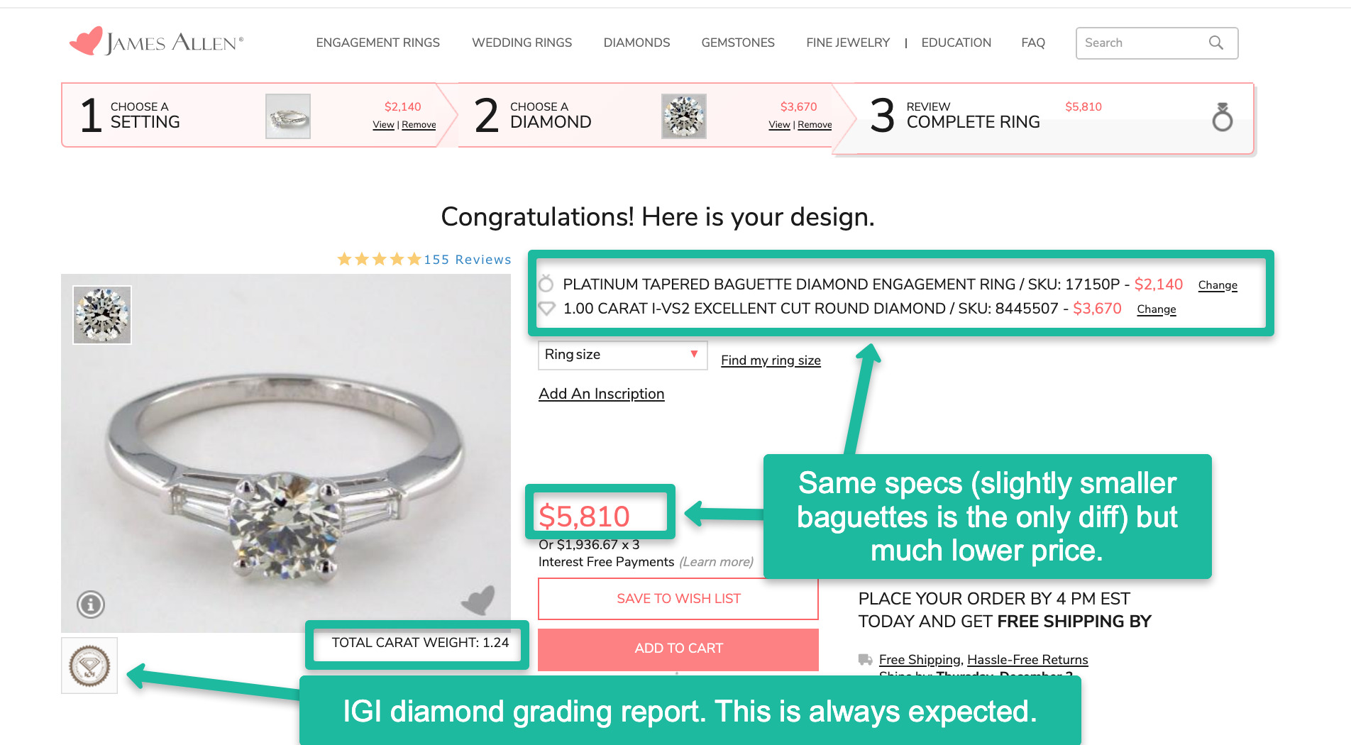 You’ll see that James Allen of course also offers an IGI diamond grading report. (You can also find, at James Allen, similar diamonds with a GIA grading report, which is the industry “gold standard.”)