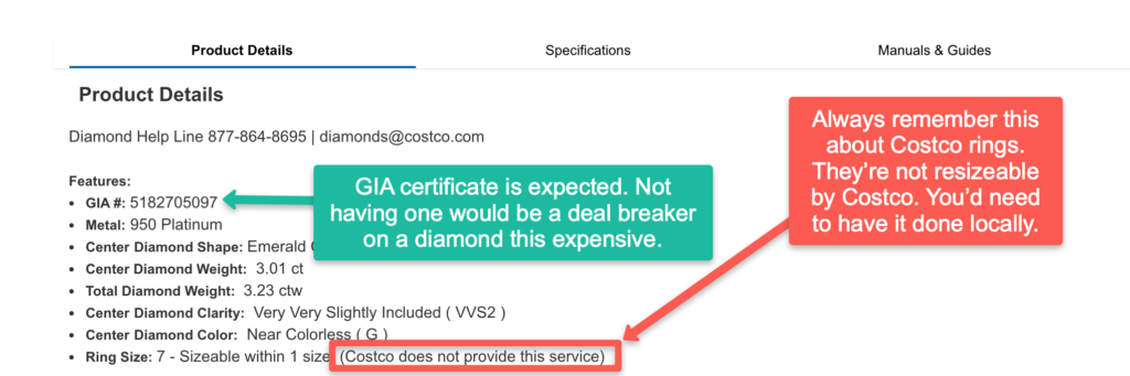 I compare as many diamond engagement rings as I can based on the facts: on data, and on specs, and on prices. Today’s value comparison starts with a Costco Emerald Cut 3.23 ctw VVS2 Clarity, G Color Diamond Platinum Engagement Ring.