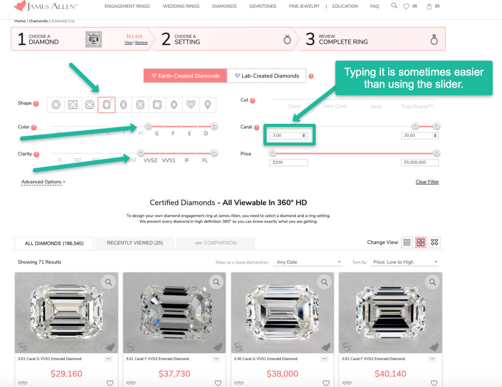 - Then go to James Allen’s diamond selector / inventory search and set your sliders as seen in the image below.
