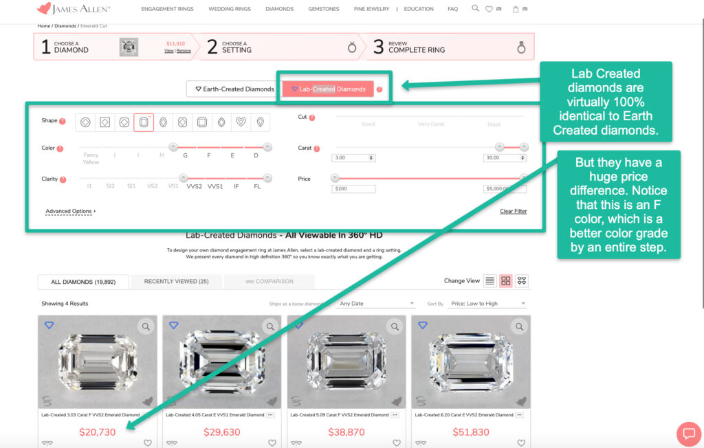 Then choose a Lab-Created diamond. They are 100% identical to earth-created diamonds, except in their origins. That’s it. See the difference in price below. (To to that, you just click the Lab-Created Diamonds button at James Allen and set your filters to look like those in the image below.)