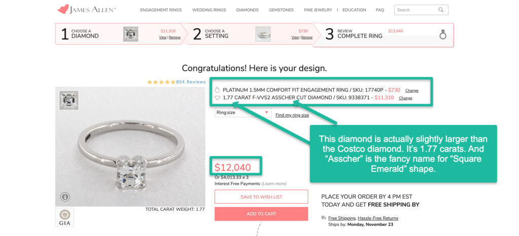 In fact, the specs are slightly better. The James Allen diamond I happened to find weighs 1.77 carats, which is slightly larger than the 1.7 carats of the Costco diamond.