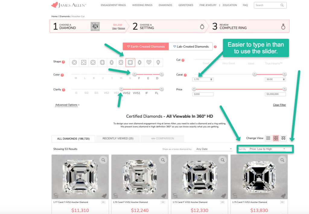 - Go to the James Allen diamond inventory search tool (so easy to use) and set your filters/sliders as shown in the image below. (The link may already do that for you. But if not, then just do it manually.