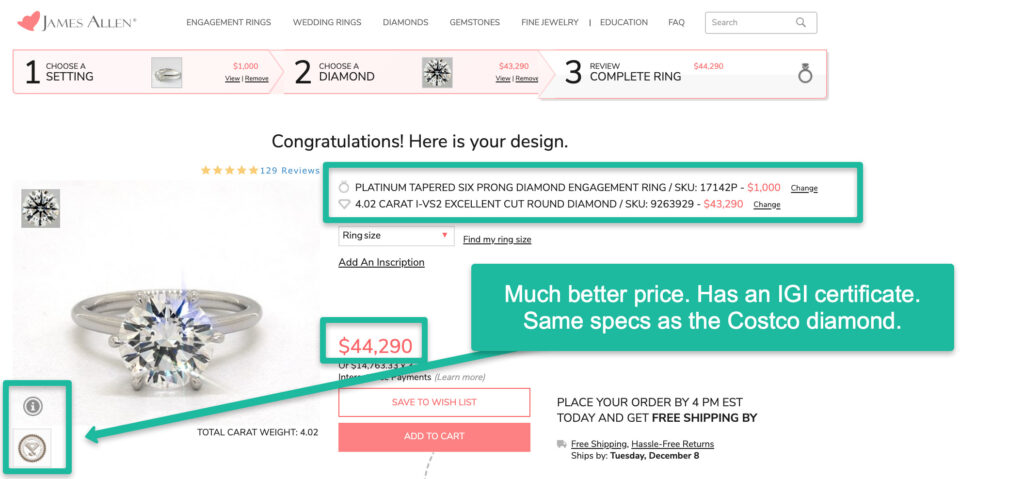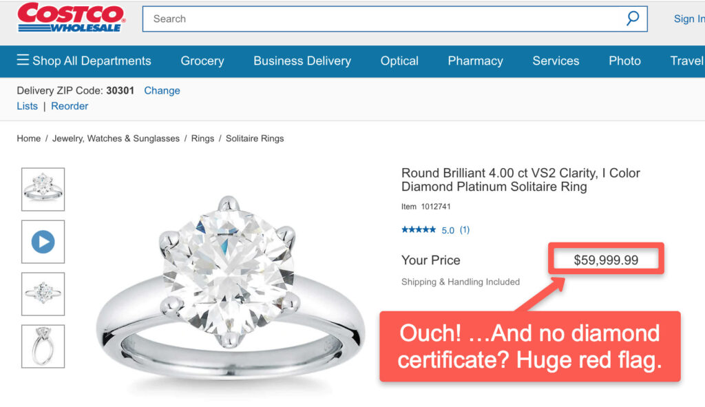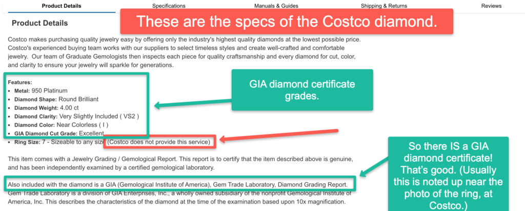 (Turns out there IS actually a GIA certificate. Read on to know why it wasn’t easy to spot in this Costco listing. (But that in no way helps the price!)