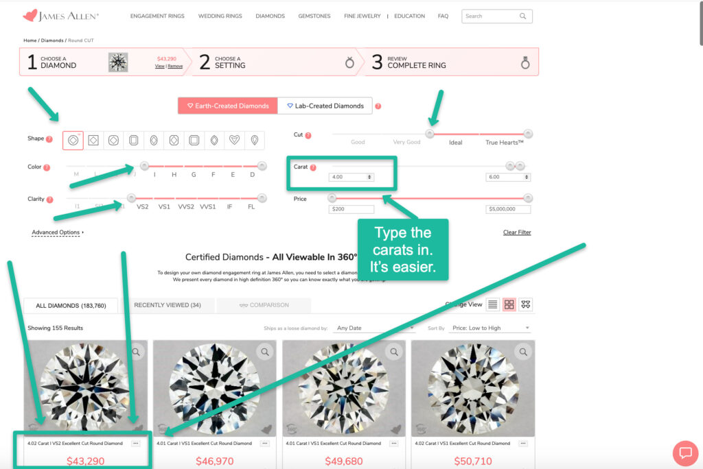 2. Go to my pre-set James Allen diamond search results and select a diamond from the first 2 or 3 diamonds in the list. (James Allen diamonds are unique, so I can’t of course send you straight to a specific diamond. It would sell out quickly.)