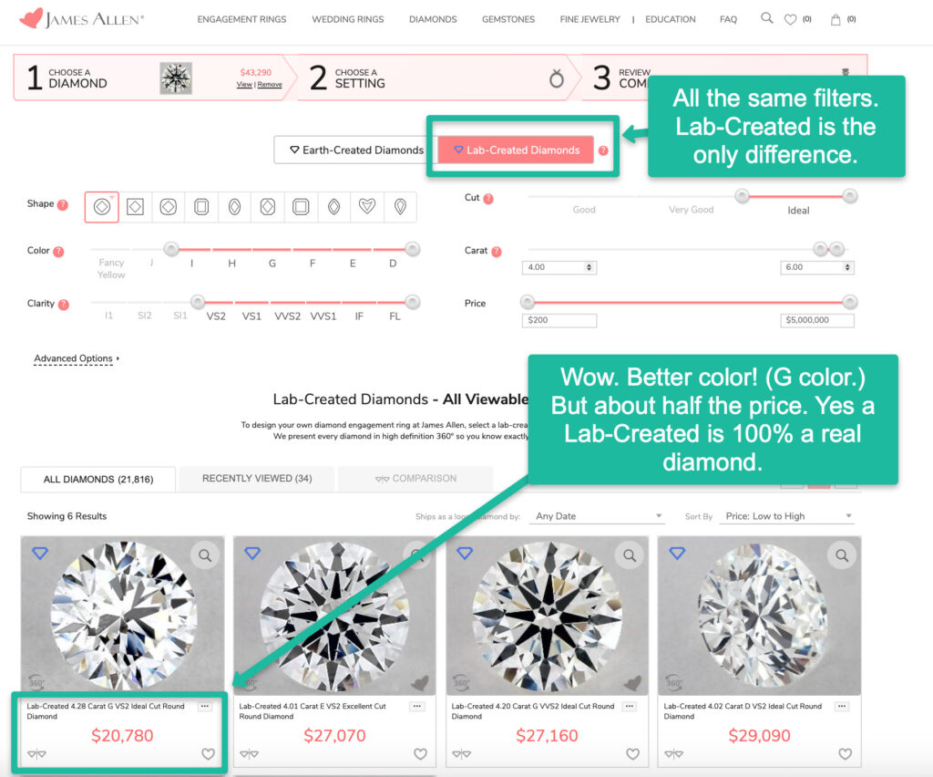 To see prices of lab-created diamonds at James Allen, click the “Lab-Created Diamonds” filter. (See the image blow.) (Or use my pre-set Lab-Created Diamonds search results.)