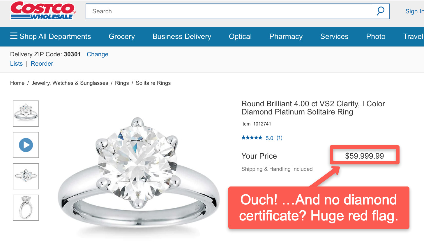 (Turns out there IS actually a GIA certificate. Read on to know why it wasn’t easy to spot in this Costco listing. (But that in no way helps the price!)