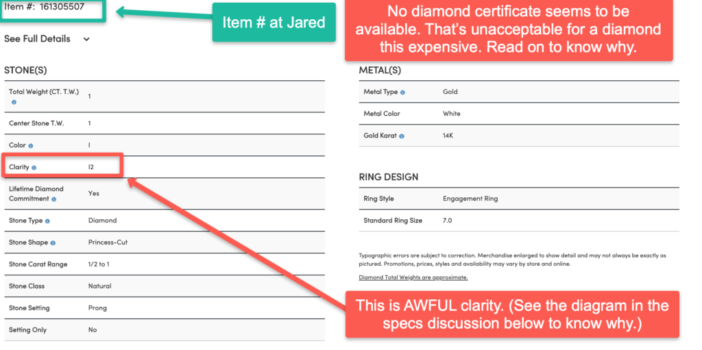 Jared offers this Diamond Solitaire Ring, with a 1-carat Princess-cut diamond, in 14K White Gold, for $3,400. But it has a LOT of red flags, from my personal viewpoint. And it should from yours as well. Here’s how to get a better ring for less.