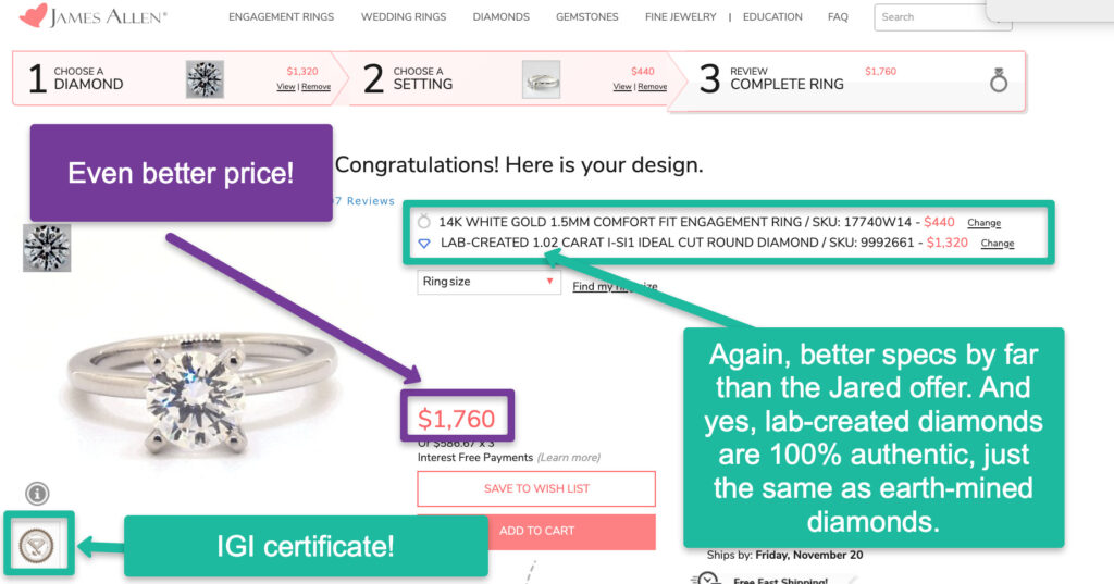 Getting the deal at Jared deal is easy. You just buy it on the site. (Please don’t! That I1-Clarity score is scary to me.)