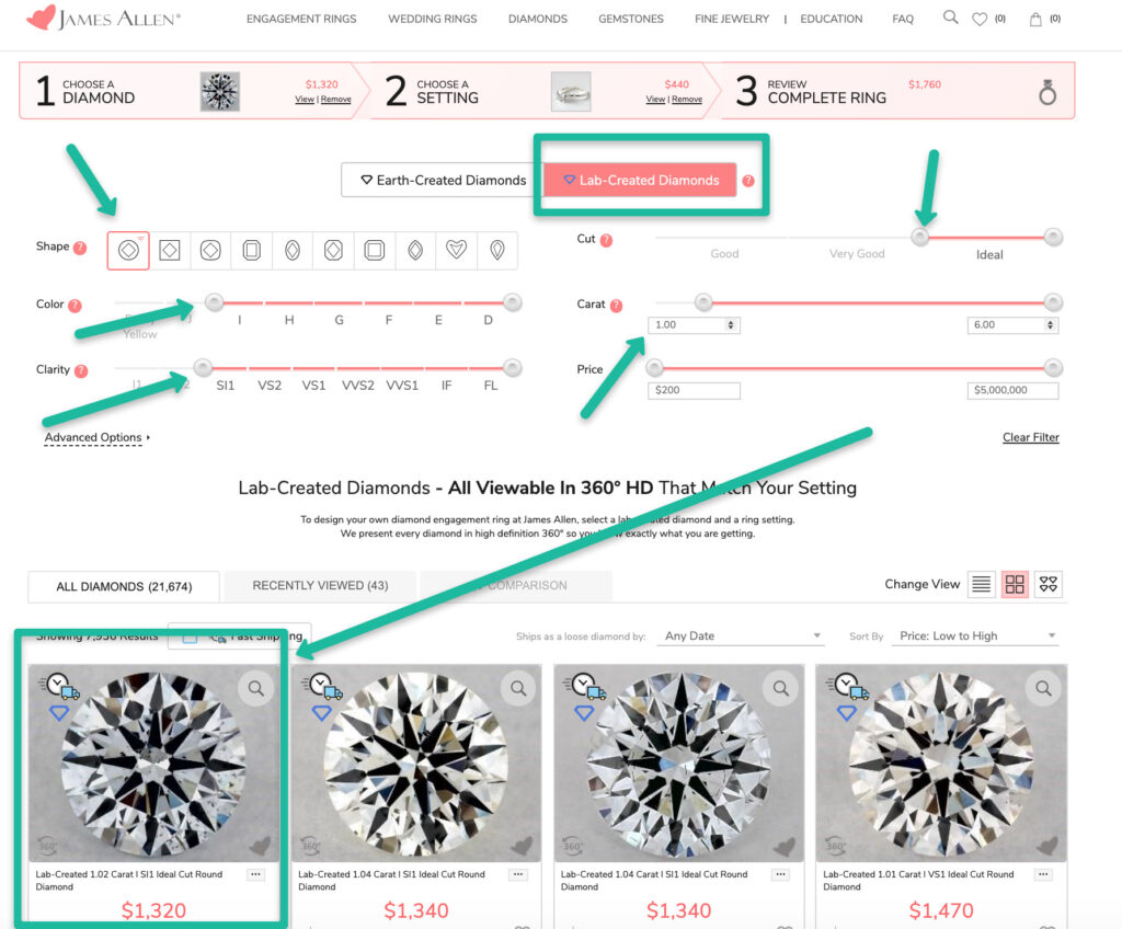 3. For even greater savings, click the “Lab-Created Diamonds” filter. (Use my pre-set Lab-Created Diamonds search results.)