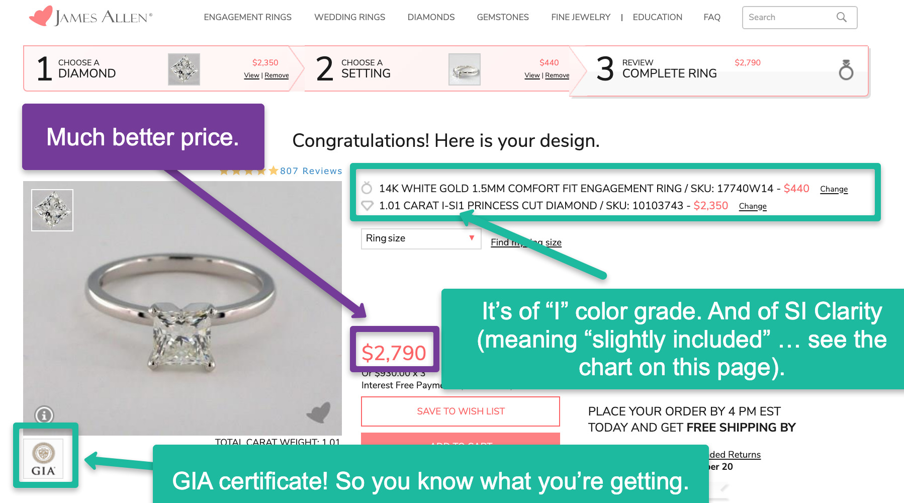 Remember, diamonds are unique products. So the diamonds you see in the screen shots of James Allen may have been sold to someone else. However, James Allen has a huge inventory of diamonds. You’ll certainly find others that are easily comparable in quality and price.