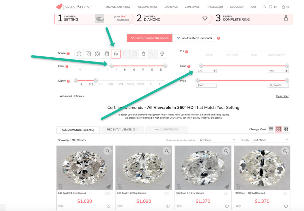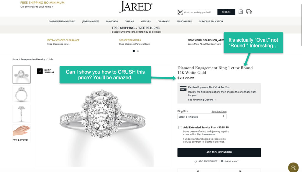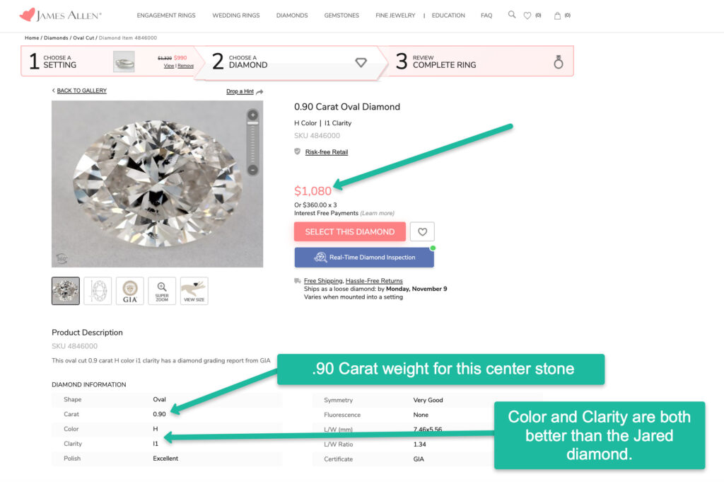 I’ll show you how to select a diamond at Jared. Then I’ll show you how to search for — and find — the same quality diamond (actually better) at James Allen. For much, much less.