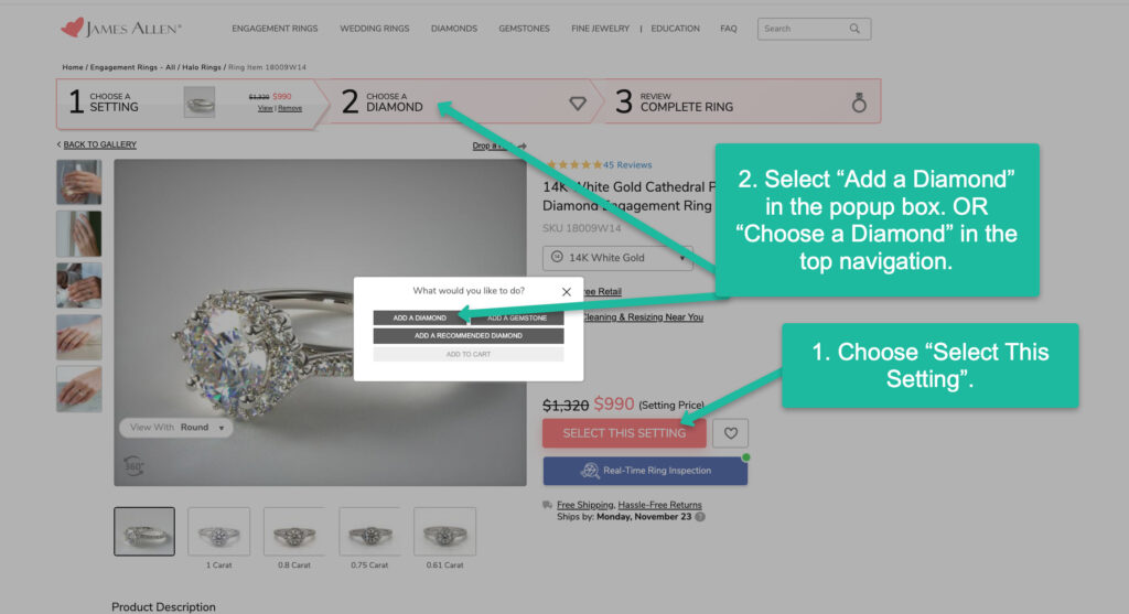 After you select “Select This Setting”, you will add a diamond. You can choose “Add a Diamond” in the popup menu. OR “Choose a Diamond” in the top navigation. Both take you to the same awesome page …