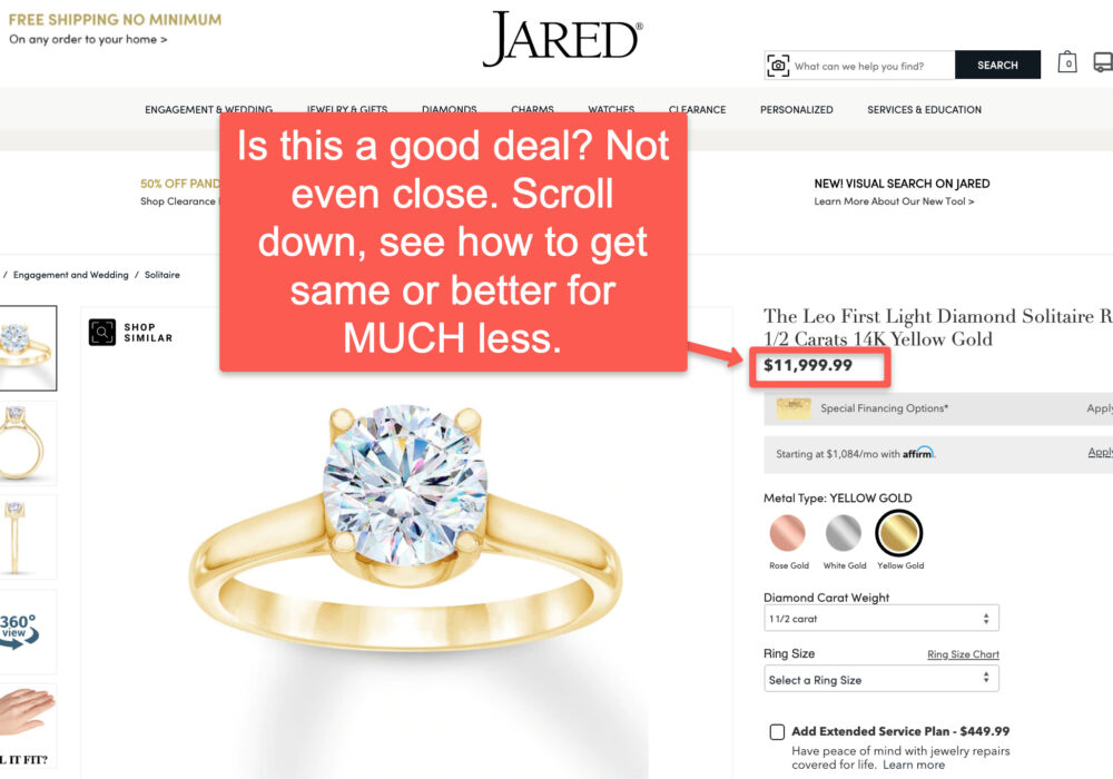 Is this 1-1/2-carat diamond solitaire engagement ring from Jared a good deal at $12,000? No. Here’s how to get the same quality or better ring for much less.
