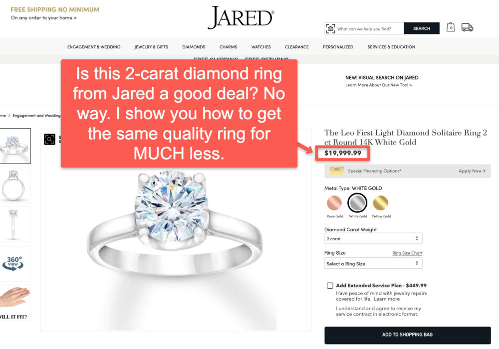 Is this 2-carat diamond solitaire engagement ring from Jared a good deal at $20,000? No! Here’s how to get the same quality or better ring for FAR less.