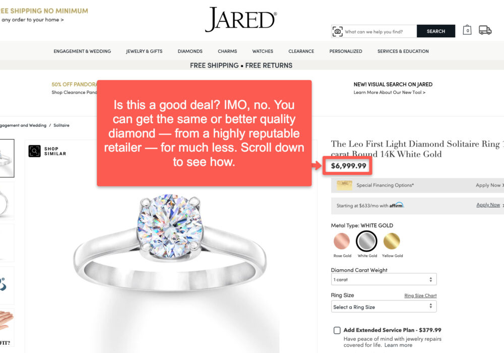 Is this 1-carat diamond solitaire engagement ring from Jared a smart buy at $7,000? No. You can get the same quality or better ring for MUCH less.
