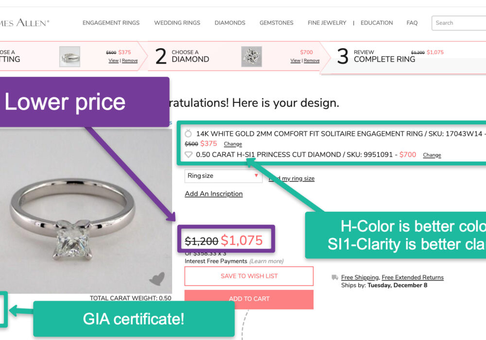 Jared offers this ring for $4,999.99. I’m not finding that it has any diamond certificate, either. But you can get such a ring with an IGI diamond certificate, with better specs, and slightly bigger diamonds, from James Allen, for as low as $1,040. There’s no catch. James Allen is just more transparent, has lower overhead, […]