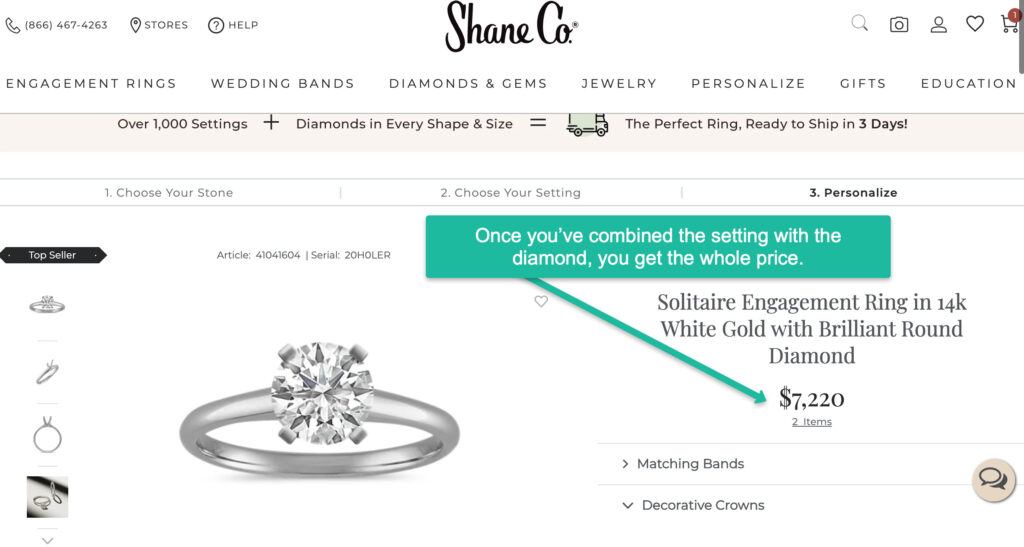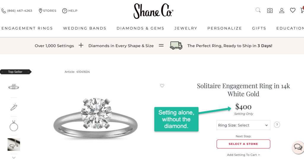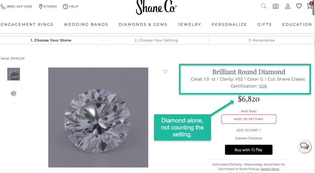 Here’s the Shane Co. diamond for $6,820 (not counting the setting, which we’ll add next).