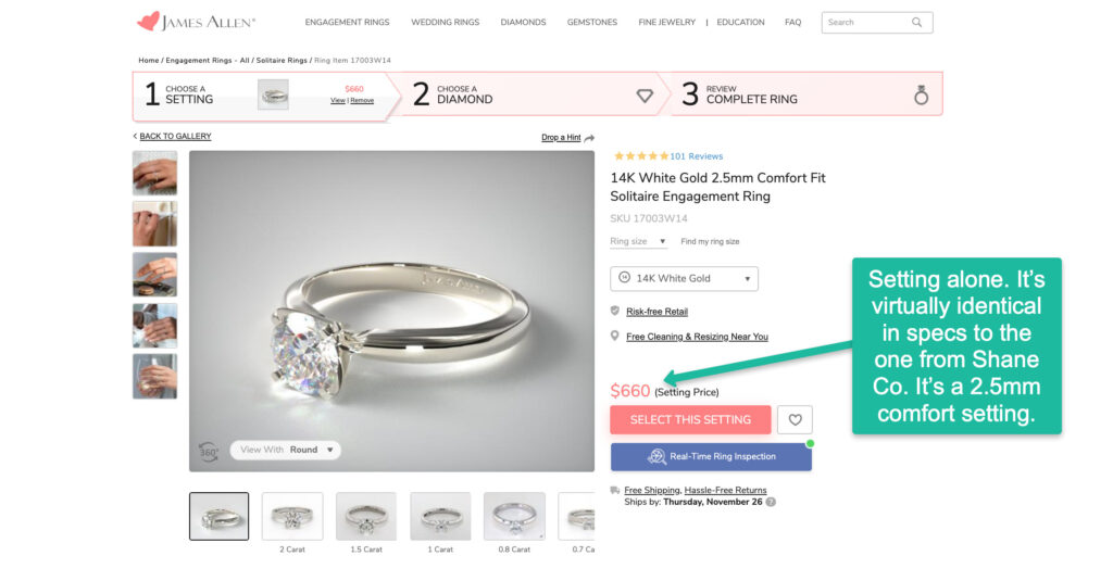 Let’s now look at the James Allen setting. It’s virtually identical to the Shane Co. setting. It’s $660.