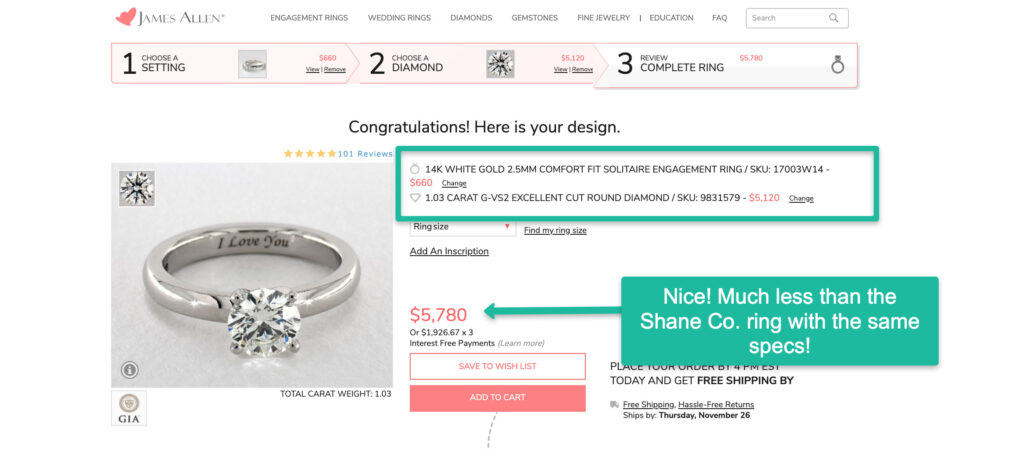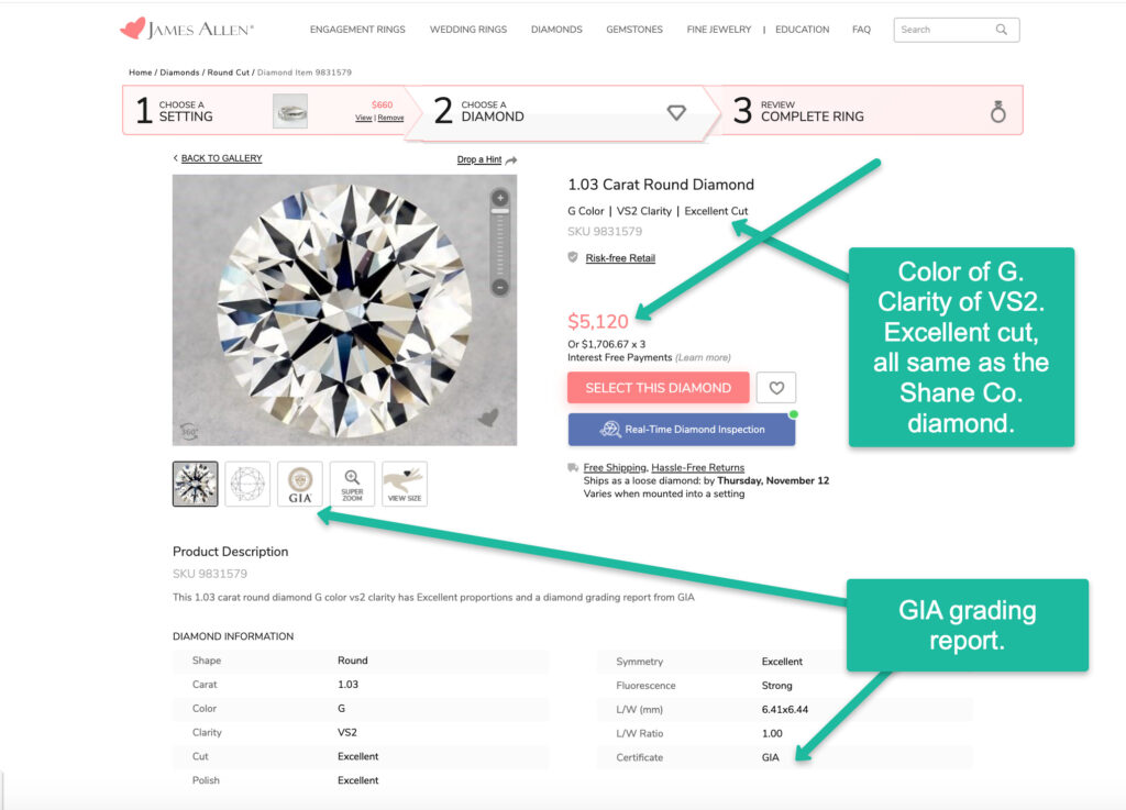 Now look at the whole package from James Allen. It’s only $5,780. Much less than Shane Co.!