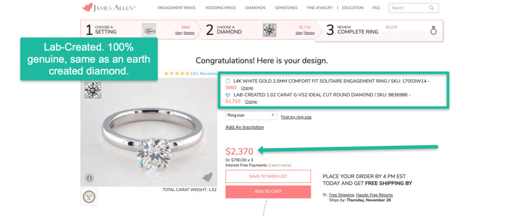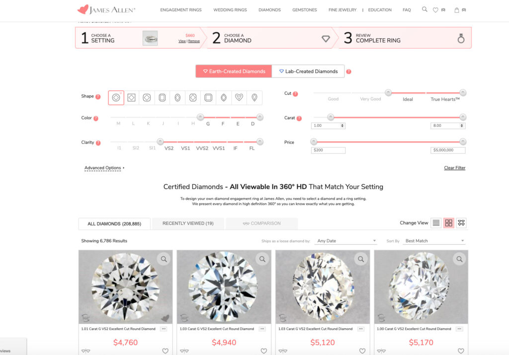 James Allen beats Shane Co. in price even on an Earth Created diamond ring. These rings have the same specs. James Allen’s is just less expensive because they have a more efficient business model.