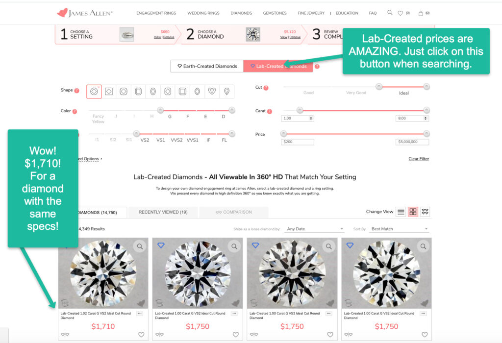 And if you go with the most environmentally friendly diamonds of all, Lab-Created diamonds, you’ll save even more. A LOT more.