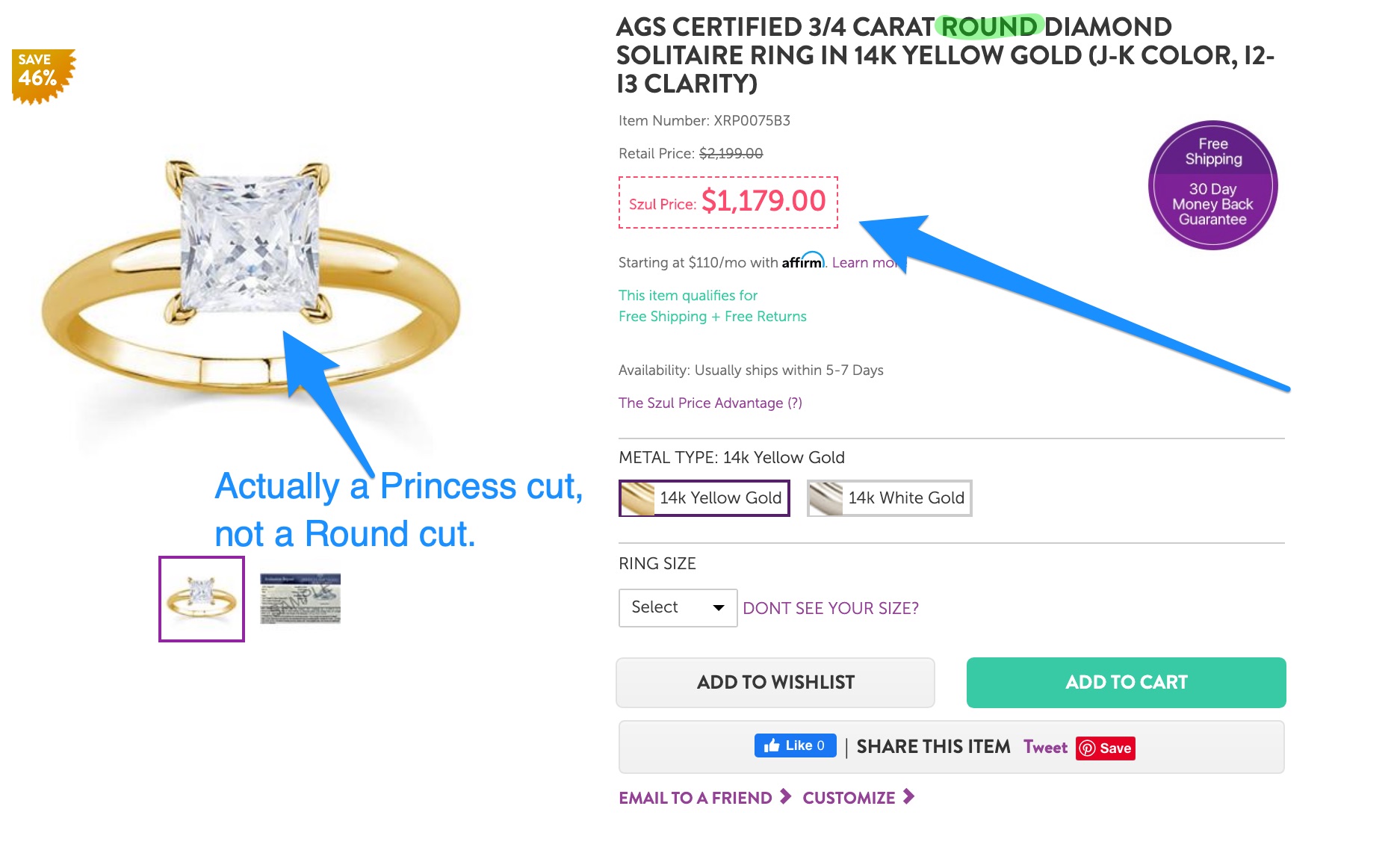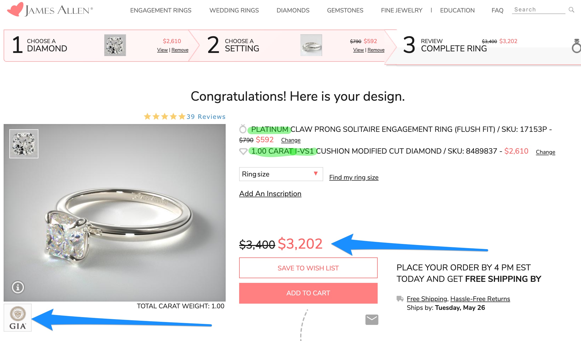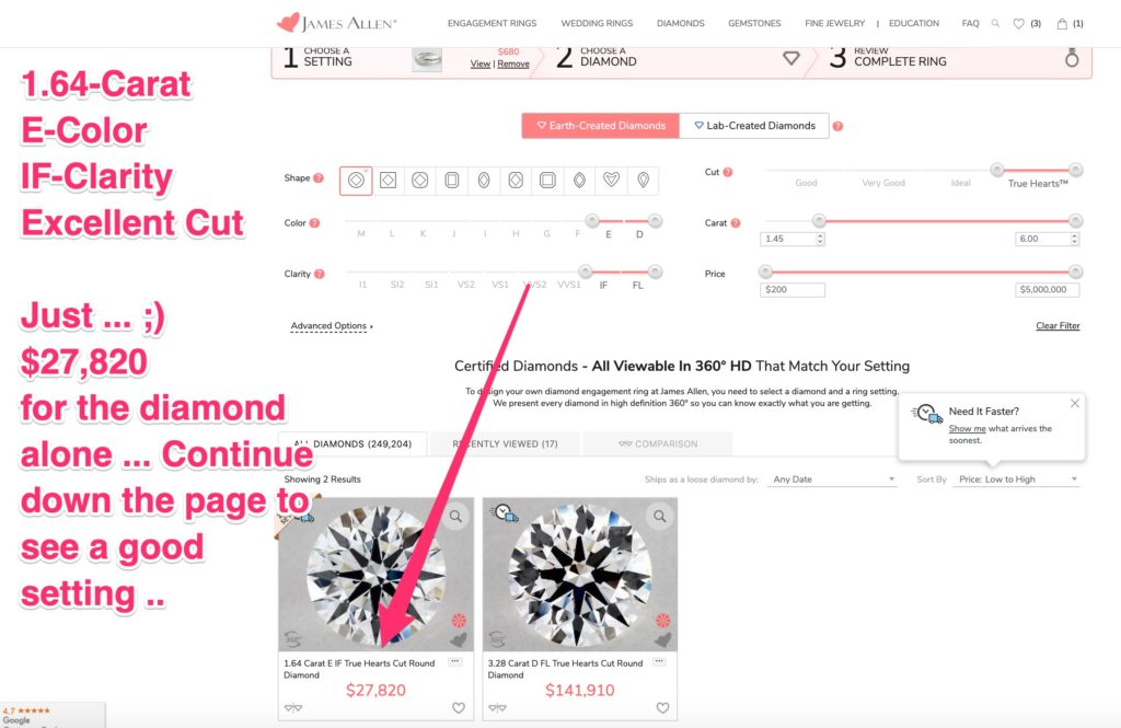 $790, on sale at the time of writing for $592.) - After completing #2 above, go here and click “Select This Diamond.” (Each diamond is unique, so it may have been purchased by the time you get there. If it is, then simply use the diamond filters here to look for a similar one.)