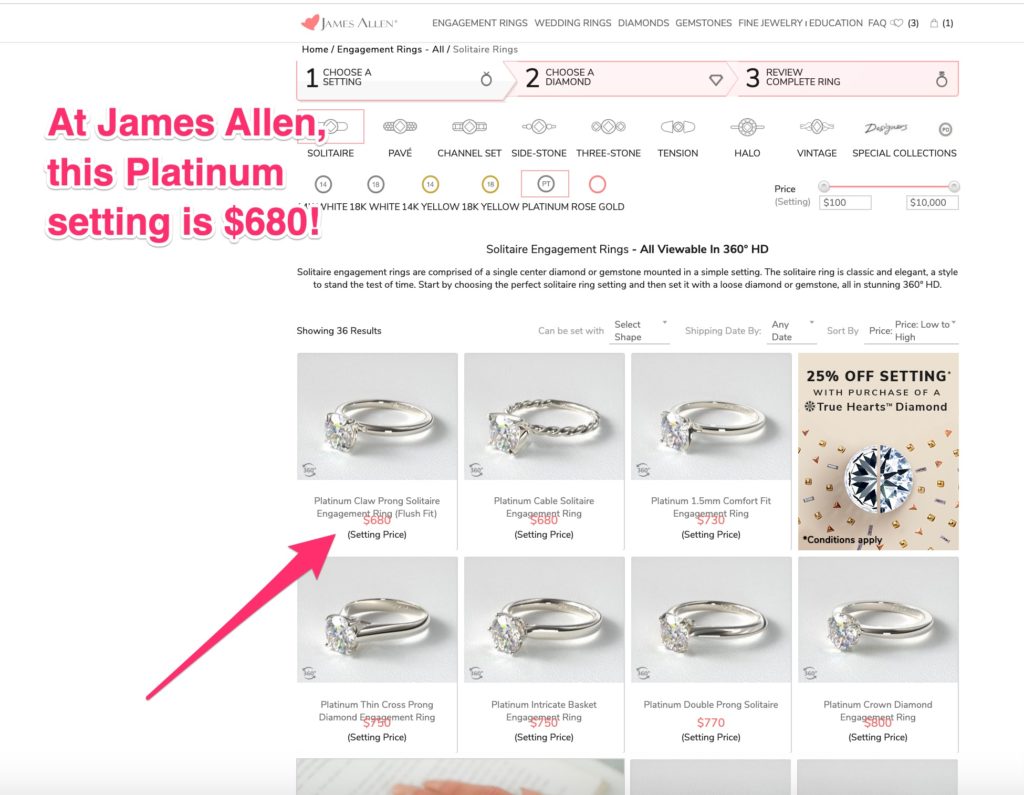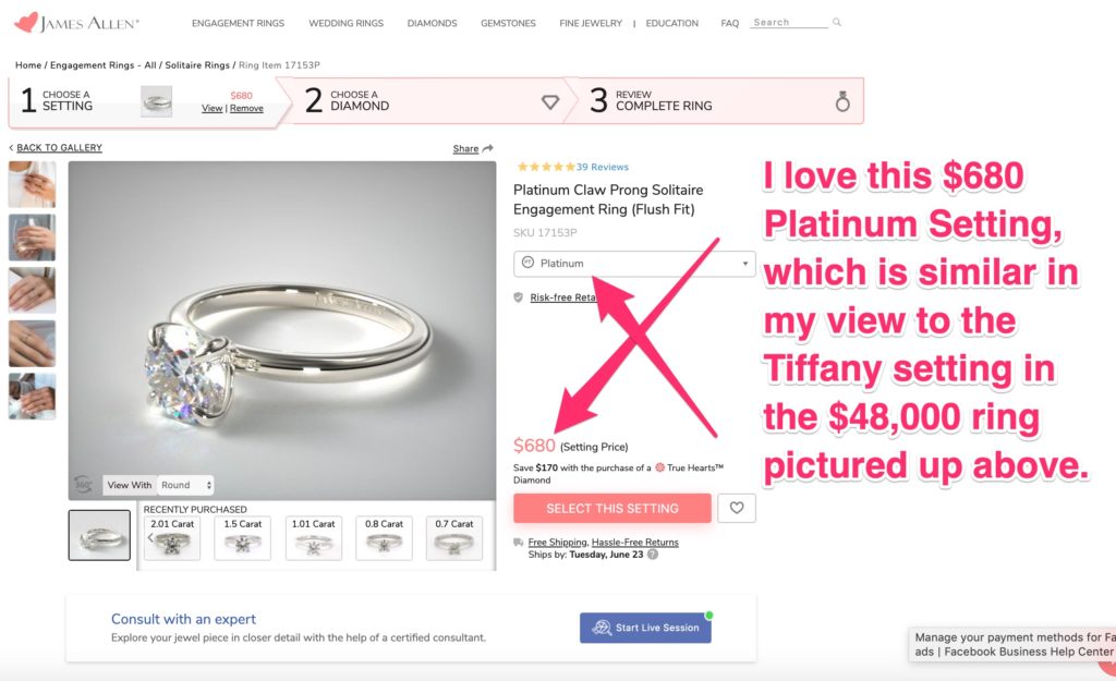 First, choose this platinum setting at James Allen, similar to the platinum setting at Tiffany …