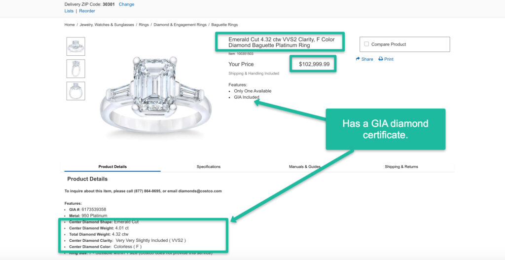 (This isn’t a deal-breaker. In truth, no 3rd-party grading lab, such as the GIA, grades the cut quality of anything except Round Brilliant Diamonds. But it’s concerning that, this being Costco, nothing at all is said about the quality of the cut.