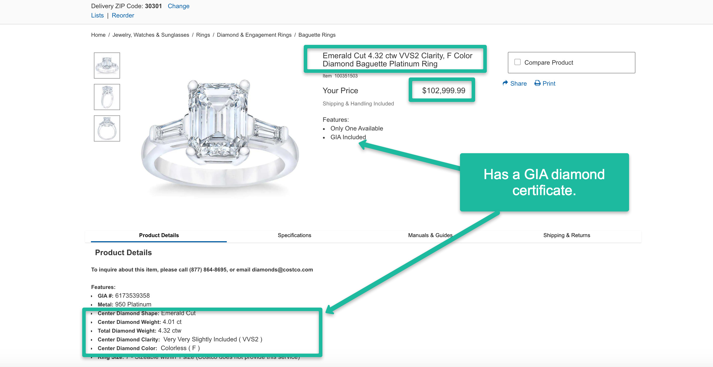 (This isn’t a deal-breaker. In truth, no 3rd-party grading lab, such as the GIA, grades the cut quality of anything except Round Brilliant Diamonds. But it’s concerning that, this being Costco, nothing at all is said about the quality of the cut.